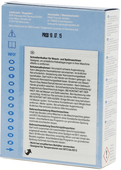 Для стиральной машины — высыпают содержимое пачки в барабан без белья, запускают программу для цветного белья 60˚C без предварительной стирки. Для посудомоечной машины — запускают без посуды на программе до 65˚C, через 30 минут осторожно открыть машину и высыпать порошок, затем запустить программу еще раз.