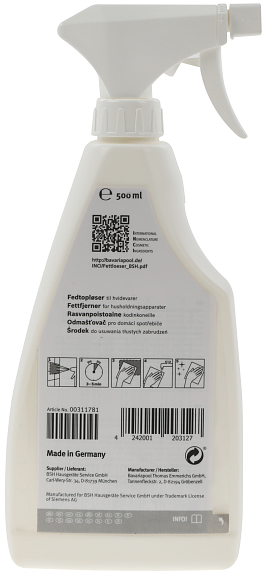 Интенсивный растворитель жира Bosch подходит для вытяжек, электрических и газовых плит, духовых шкафов, микроволновых печей, керамической плитки, пластика, кухонной мебели (столешницы, мебельные фасады и пр.).