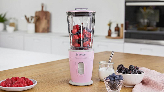 Стационарный блендер Bosch MMBM4G6K розового цвета изготовлен из прочного пластика, а чаша из термостойкого стекла, поэтому модель подходит для приготовления как горячих, так и холодных напитков.
