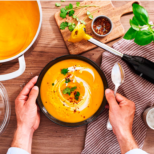 Устройство оснащено ножом с четырьмя лезвиями QuattroBlade, что позволяет эффективно справляться с измельчением и смешиванием ингредиентов. Управление блендером осуществляется с помощью кнопок и поворотного переключателя, что делает процесс приготовления максимально интуитивным. Эргономичная ручка с мягким покрытием Soft-touch обеспечивает комфортное и надежное удержание устройства в руках, предотвращая скольжение.