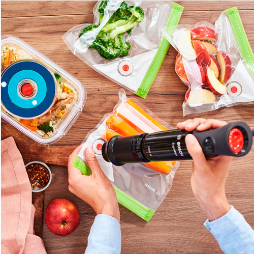 Особенностью модели является наличие вакуумного насоса и контейнера объемом 1.2 литра, а также шести вакуумных пакетов с замком, что позволяет сохранять свежесть продуктов на более длительный срок. Съемные детали устройства можно мыть в посудомоечной машине, что значительно упрощает уход за устройством.