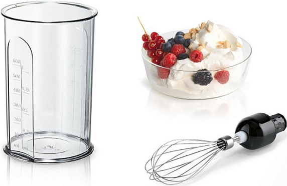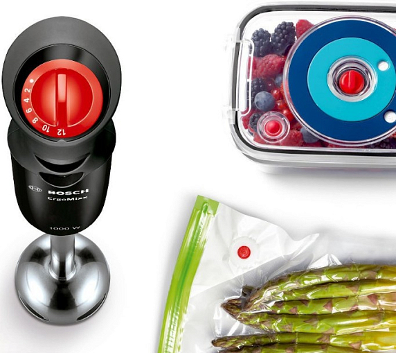 Блендер BOSCH MS6CB61V5 выполнен в черном цвете, является элементом коллекции ErgoMixx. Корпус выполнен из пластика, а погружная насадка из нержавеющей стали, которая гарантированно долго прослужит за счет повышенной прочности материала и устойчивости к внешним воздействиям. Нож блендера оснащен четырьмя лезвиями QuattroBlade. Управление осуществляется с помощью кнопок и поворотного переключателя. Эргономичная рукоять оборудована прорезиненным покрытием, которое обеспечит надежную фиксацию во время работы. В стандартную комплектацию входят: мерный стакан, чаша измельчителя с крышкой, венчик для взбивания, вакуумный насос, контейнер и пакеты с замком. Все съемные детали можно мыть в посудомоечной машине, что значительно облегчает уход за прибором.