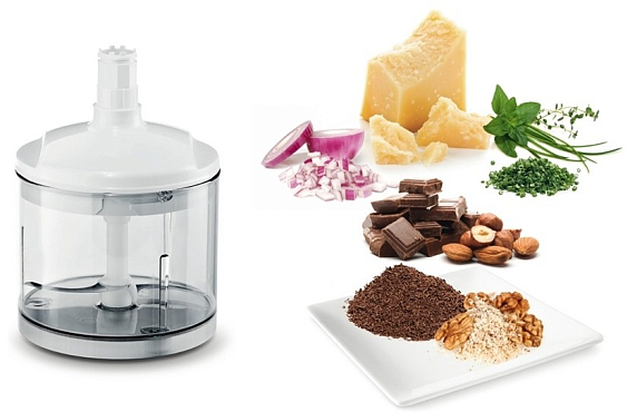 В комплект входит мерный стакан, в котором можно хранить измельченную еду, а также насадка-комбайн. Она представляет собой универсальную чашу с ножом для измельчения твердых продуктов. Уход за съемными деталями блендера довольно прост, так как их можно мыть в посудомоечной машине. Прибор произведен в Евросоюзе, а также имеет срок гарантии длительностью 12 месяцев.
