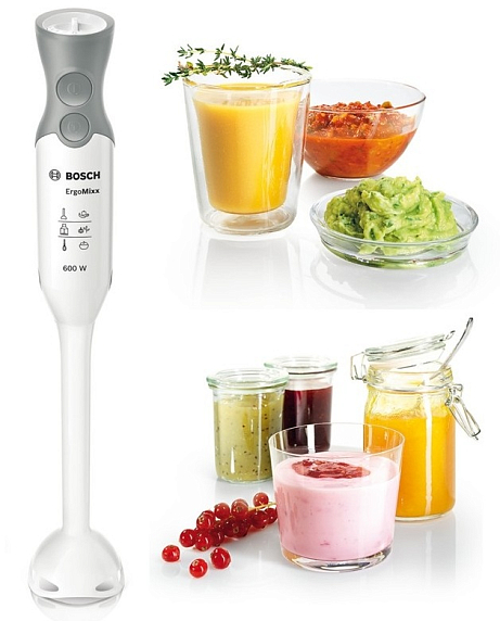 Блендер Bosch MSM 14500 — это погружная модель из серии ErgoMixx. Она представлена в сочетании белого и серого цветов, что позволяет ей вписаться в кухонный интерьер различных видов. Термостойкий пластик, из которого изготовлены корпус, погружная часть и чаша измельчителя, позволяет готовить горячие блюда — например, супы. Устройство оснащено ножом с четырьмя лезвиями QuattroBlade, которые способны качественно измельчить твердые продукты до состояния однородной массы.