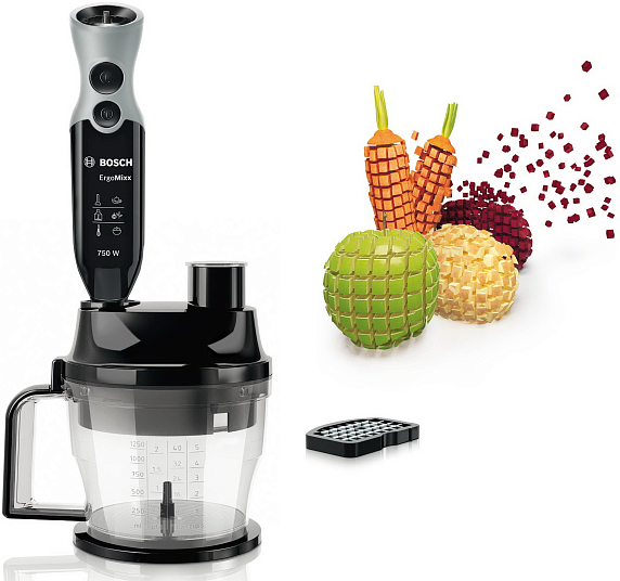 Универсальный измельчитель с чашей можно использовать для приготовления мясного фарша, мелкой резки сыра, лука и зелени, дробления орехов. Специальная чаша с функцией кухонного комбайна оснащена диском Kubixx для измельчения кубиками овощей и фруктов, а также сменными терками.