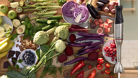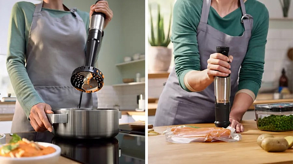 В комплекте с блендером идут мерный стакан и венчик для взбивания, а также насадка-комбайн с универсальной чашей и ножом для измельчения твердых продуктов, три режущие вставки для шинковки и терки, насадка для замеса теста и две насадки для нарезки кубиками разного размера. Проталкиватель и вакуумный насос также входят в комплект. Кроме того, есть вакуумный контейнер объемом 0.5 литра для хранения продуктов.