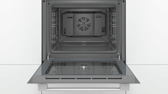 Бош HBF214BW0R прост и удобен в управлении. Две рукояти серебристого цвета отвечают за выбор функций и регулировку температуры. В нулевом положении ручки-переключатели утапливаются в рабочую панель и извлекаются наружу лёгким нажатием.