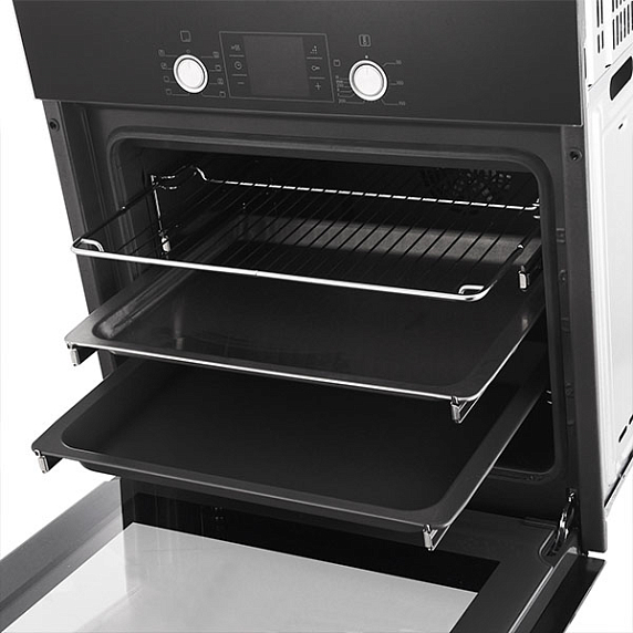 Электрический духовой шкаф HBG43T151R с функцией разморозки — многофункциональная модель от Bosch. Утапливаемые переключатели смотрятся эстетично, а также выполняют защитную функцию, предупреждая случайное включение прибора. Амортизатор SoftClose обеспечивает плавное открытие и закрытие дверцы даже при резком движении. Телескопические направляющие легко выдвигаются для безопасного доступа к горячим противням. Фронт из закаленного стекла — элегантная и практичная альтернатива нержавеющей стали.