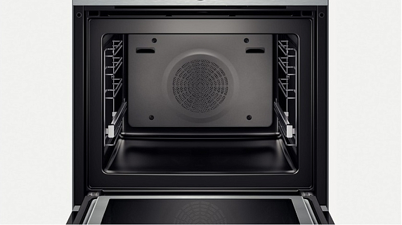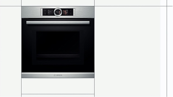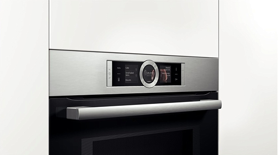 Духовой шкаф Bosch HMG636NS1 выполнен в строгой чёрно-белой гамме. На панели управления размещаются три цветных TFT-дисплея. Сенсорам соответствуют символы: menu, Таймер, Информация, а также блокировка от детей.