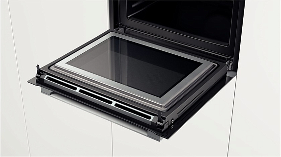 Помимо прочего, Бош HMG636NS1 оснащён системой Assist с анимацией. Выбрав эту опцию, вы получите доступ к настройкам, адаптированным под конкретные рецепты. Для просмотра меню предусмотрена единая структура, включающая в себя категорию, вид и название блюда. После помещения подготовленных продуктов в духовку, вам останется только указать их вес.