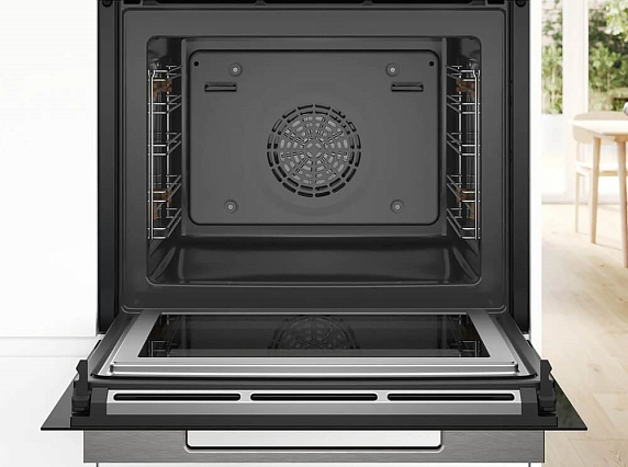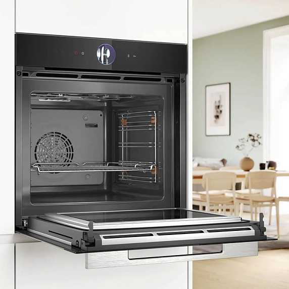 Управление прибором осуществляется с помощью 2.5″ цветного TFT дисплея с сенсорными кнопками, что обеспечивает удобство и простоту использования. Встроенные электронные часы и таймер позволяют точно следить за временем приготовления блюд, а функция Home Connect обеспечивает возможность управления прибором дистанционно. Духовой шкаф Bosch HMG7361B1 предлагает 14 режимов нагрева, включая 4D-горячий воздух, верхний/нижний жар, большой и малый гриль, режим для пиццы, подогрев посуды, поддержание температуры и размораживание. Диапазон температур варьируется от 30 до 300 градусов, что позволяет готовить блюда с различными кулинарными требованиями. Кроме того, прибор оснащен 10 автоматическими программами и 5 уровнями мощности микроволн для максимального удобства.