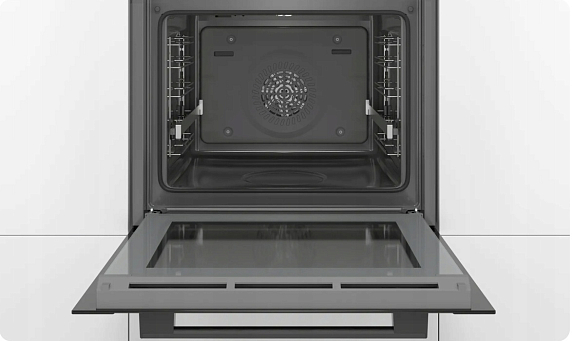 Духовой шкаф Bosch HRA334EB0 объемом в 71 литр имеет два стекла дверцы для более безопасной эксплуатации устройства.