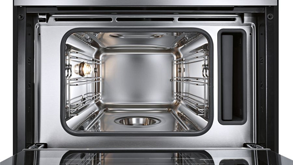 Модель имеет 4 режима нагрева и 20 автоматических программ. Есть функция размораживания, а также режим подъёма теста и подогрева готовых блюд. Последовательность режимов нагрева и время приготовления пароварка выбирает самостоятельно, в зависимости от указанного блюда и веса. Управление осуществляется при помощи поворотного переключателя ControlRing и интерактивного TFT-дисплея — это удобно и даёт прямой доступ к основным функциям и режимам. За выдвижной панелью управления находится съёмный резервуар для воды объёмом 1,3 л. Дверца с амортизатором плавно и бесшумно открывается и закрывается даже при резком движении. Индикатор остаточного тепла, блокировка от детей и система охлаждения обеспечивают безопасную эксплуатацию. Очистка осуществляется традиционным способом. Для продления срока службы прибора предусмотрена программа удаления накипи. Модель комплектуется губкой и двумя паросборниками размера L: один с отверстиями, второй — без.