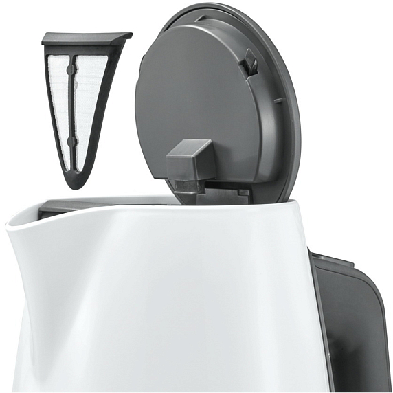 Чайник Bosch TWK 6A011 в белом цвете оснащен тройной системой защиты — отключается при снятии с цоколя.