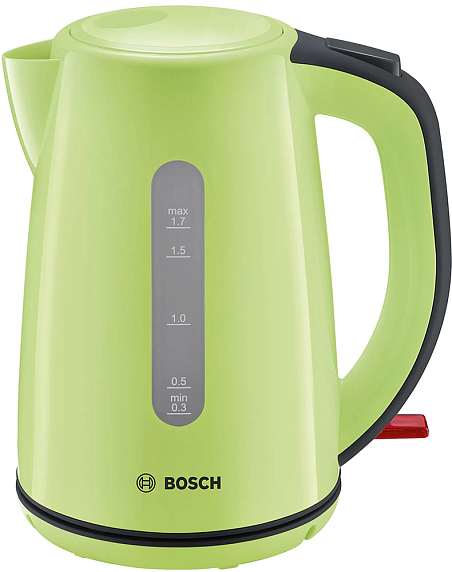 Чайник Bosch TWK 7506 в зеленом цвете оснащен шкалой уровня воды с обеих сторон, что упрощает использование прибора.