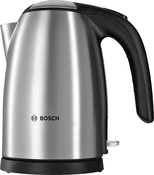 Чайник Bosch TWK 7801 выполнен из нержавеющей стали с пластиковыми элементами и цоколем с поворотом на 360 градусов.
