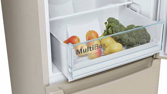 Большой ящик имеет волнистое дно, это защищает овощи и фрукты от конденсата. Полки из ударопрочного стекла удобны в уходе.