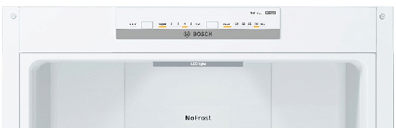 Электронная панель управления расположена сверху, там же находится встроенная светодиодная подсветка. В Бош KGN36NW21R встроены такие удобные опции, как: