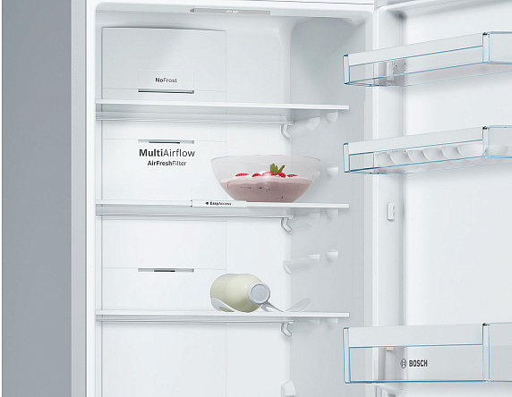 Двухкамерный холодильник Bosch KGN36VL21R с системой охлаждения NoFrost не нуждается в размораживании, так как влага отводится из морозильной камеры при помощи вентилятора, поэтому снег и наледь не образуются. Угольный фильтр AirFresh нейтрализует неприятные запахи и бактерии в течение всего срока службы прибора.