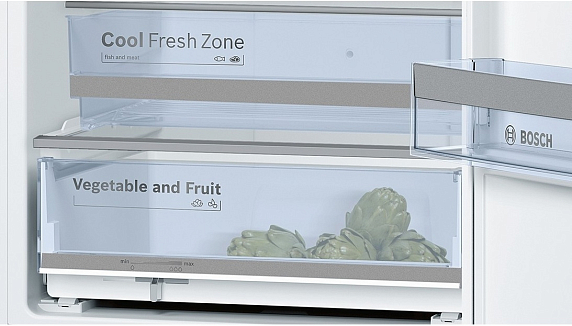 Двухкамерный холодильник KGN36XW14R с нижней морозильной камерой и зоной Chiller позволяет сохранять продукты до двух раз дольше. Сухая зона свежести сохраняет питательные вещества, вкус и внешний вид мяса и рыбы. Волнистое дно в ящике для овощей и фруктов снижает площадь соприкосновения с поверхностью. Вследствие чего происходит лучшая циркуляция воздуха, и продукты дольше остаются свежими. Эргономичное расположение полок и дополнительные подвесные аксессуары увеличивают полезную площадь холодильника. Технология No Frost обеспечивает полное отсутствие льда в морозильной камере.