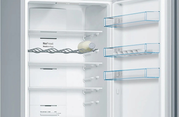 Холодильник BOSH KGN392LD — двухкамерная модель, выполненная в цвете нержавеющей стали. Благодаря системе NoFrost на стенках прибора не образуется наледь, поэтому он не требует периодического размораживания. Циркуляция воздушных потоков MultiAirflow происходит равномерно по всему объёму камеры. Режим Super Cooling позволит быстро охладить вновь помещенные продукты в холодильную камеру. С помощью функции автоматической суперзаморозки вы сможете за короткий промежуток времени замораживать небольшие порции ингредиентов, защищая от размораживания загруженные ранее. Устройство имеет светодиодную подсветку. Данные лампы потребляют меньше электроэнергии, чем обычные и служат в течение всего срока службы прибора.