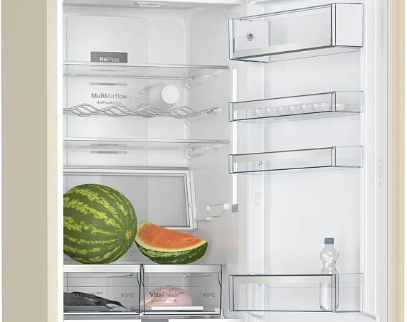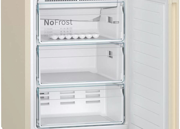 Двухкамерный холодильник Bosch KGN39AK32R выполнен в пастельном бежевом цвете и оборудован правым дверным упором с возможностью перенавешивания двери. Прибор оборудован системой охлаждения NoFrost, поэтому его нет необходимости размораживать. Для эффективного хранения овощей и фруктов в холодильной камере предусмотрена зона свежести VitaFresh, при температуре около 0°C продукты сохраняют витамины и привлекательный внешний вид в 2-3 раза дольше.