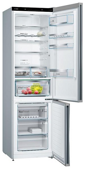 Холодильно-морозильная комбинация с технологией NoFrost и зоной свежести VitaFresh plus сохраняет свежесть продуктов до 2 раз дольше, благодаря оптимальному уровню влажности в ящике для овощей и фруктов и пониженным, регулируемым температурам в ящиках «нулевой» зоны для мяса и рыбы. Холодильник имеет одно из самых больших холодильных отделений (279 л) среди 2-метровых холодильников своего класса. Яркие светодиодное источники света расположены таким образом, что не перекрываются продуктами, поэтому содержимое полок и зоны свежести отлично просматривается.