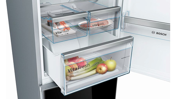 Двухкамерный холодильник Bosch KGN39JB3AR представлен в черном цвете. Благодаря классу энергопотребления A++, прибор потребляет на 20% меньше, чем устройства А класса, что позволяет экономить электроэнергию. Антибактериальный угольный фильтр AirFresh встроен в систему вентиляции и нейтрализует неприятные запахи и бактерии в течение всего срока использования, чтобы продукты дольше сохраняли свою свежесть. Комфорт эксплуатации обеспечивают удобные встроенные ручки и возможность перевешивания двери.