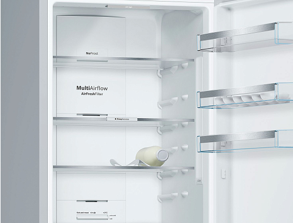 Угольный фильтр AirFresh нейтрализует неприятные запахи и бактерии. Прибор можно установить вплотную к стенам и мебели, полки и ящики при этом выдвигаются полностью, так как дверца открывается на 90°.