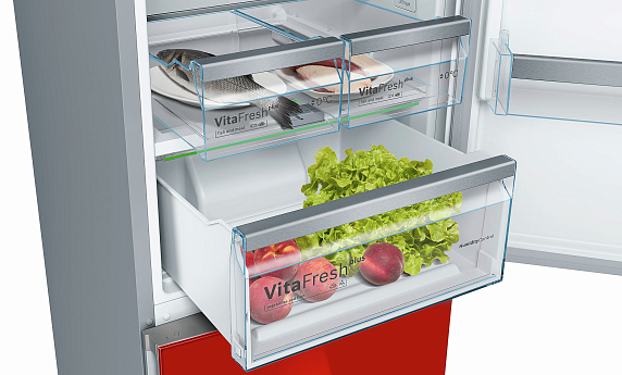 Внутреннее наполнение большого холодильного отделения 279 л можно трансформировать под свои потребности. Два контейнера с пониженной температурой используются для хранения охлажденного мяса и рыбы. Их можно вынуть, чтобы поставить высокие бутылки и формы с готовыми блюдами. Овощи и фрукты остаются свежими дольше в зоне VitaFresh plus благодаря регулируемому уровню влажности в зоне свежести.