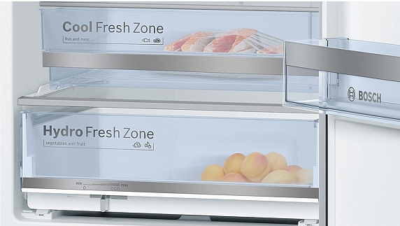 Белый двухкамерный холодильник KGN39SW10R со стеклянной поверхностью — элегантное решение от Bosch. ЖК-дисплей и электронное управление обеспечивают комфортную эксплуатацию. Отделение для бутылок и ящик для овощей и фруктов — практичные и полезные дополнения. Регулируемые полки позволяют создавать индивидуальные комбинации. Зона Chiller сохраняет мясо и рыбу свежими до 2-х раз дольше. Систем NoFrost защищает морозильное отделение от образования льда.