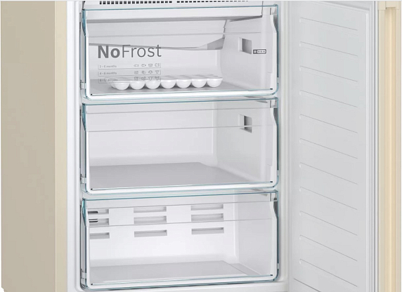 Прибор можно установить вплотную к стенам и мебели, дверь открывается на 90°, при этом ящики и полки выдвигаются полностью. Светодиодная подсветка LED ярко и равномерно освещает внутреннее пространство. Благодаря системе NoFrost нет необходимости в размораживании.