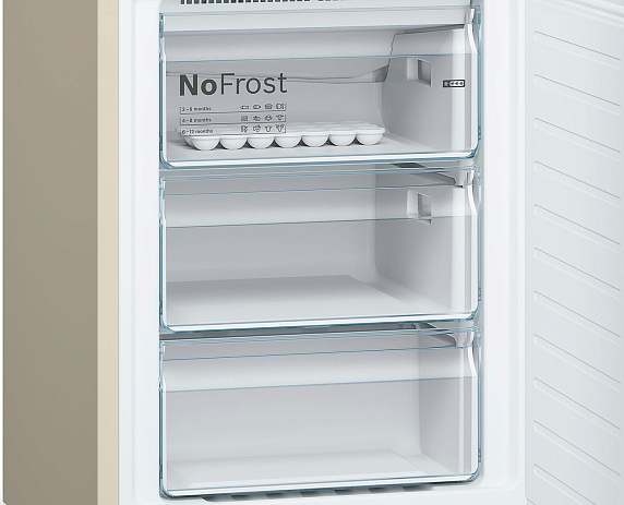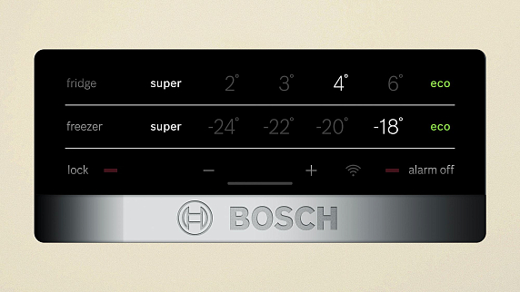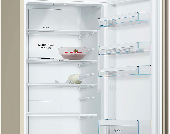 В Бош KGN39VK2AR используется хладагент нового поколения R600a. Он экологичный, безопасный для человека, быстро остывает и снижает потребление электричества. Это имеет прямое отношение к высокому классу энергоэффективности (А+) и к тому, что прибор может функционировать при температуре окружающей среды до +43°С.