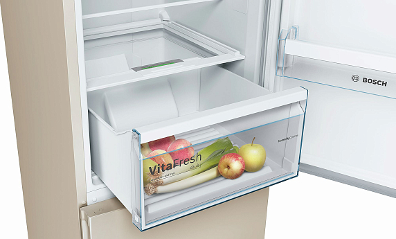 - зона свежести — названная так потому, что оптимально подобранный уровень влажности гарантирует длительное хранение и сочность фруктов и овощей. Выдвижной бокс VitaFresh из высокотехнологичного прочного пластика поможет аккуратно все разместить внутри;