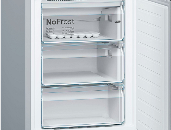 Двухкамерный холодильник KGN39XW3OR одель относится к числу приборов с одним из самых больших холодильных отделений 279 л. Система NoFrost не требует разморозки. Для длительного хранения свежих овощей предусмотрен большой ящик VitaFresh, для рыбы и мяса предназначены два малых контейнера с поддержанием нулевой температуры.