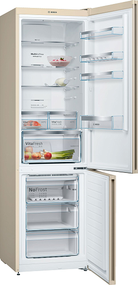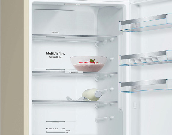 Антибактериальный угольный фильтр, установленный в Бош KGN39XK3AR, не позволяет запахам смешиваться и застаиваться. Таким образом, в холодильнике не возникает затхлость, и не размножаются бактерии. К достоинствам данной модели также относятся низкий уровень шума и класс энергоэффективности А++ .