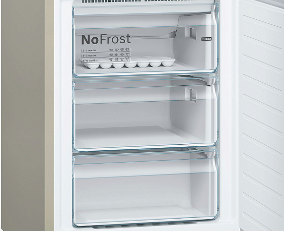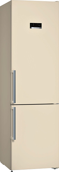 Двухкамерный холодильник KGN39XW3OR — модель бежевого цвета с 279 л. Зона свежести VitaFresh состоит из большого ящика для овощей и фруктов и двух малых для рыбы и мяса. Прибор благодаря системе охлаждения NoFrost не нуждается в разморозке.