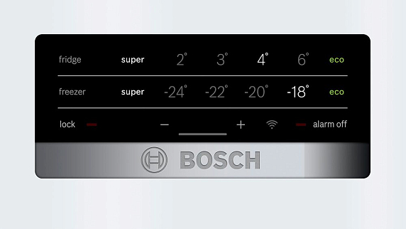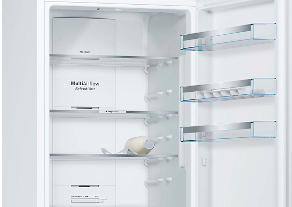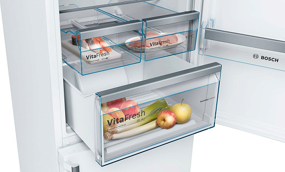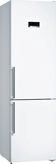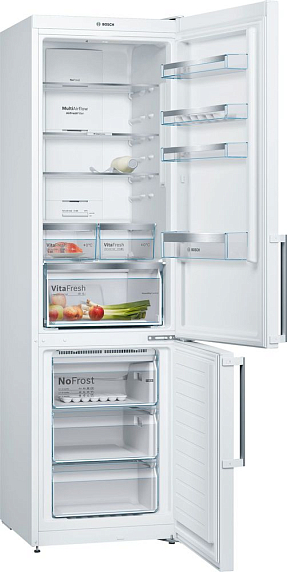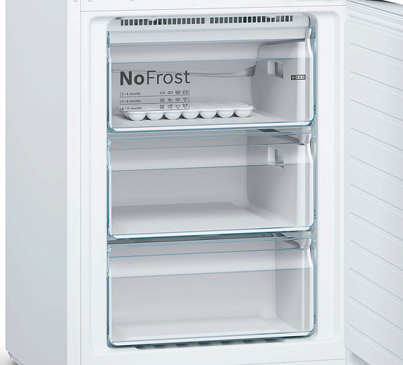 Двухкамерный холодильник Bosch KGN39XW34R оборудован системой NoFrost, которая защищает холодильное и морозильное отделения от образования наледи, благодаря чему прибор не требует разморозки. Источники светодиодной подсветки расположены таким образом, что не перекрываются продуктами и посудой. Функции суперохлаждения и суперзаморозки гарантируют сохранение свежести продуктов, помещенных в любую камеру устройства.