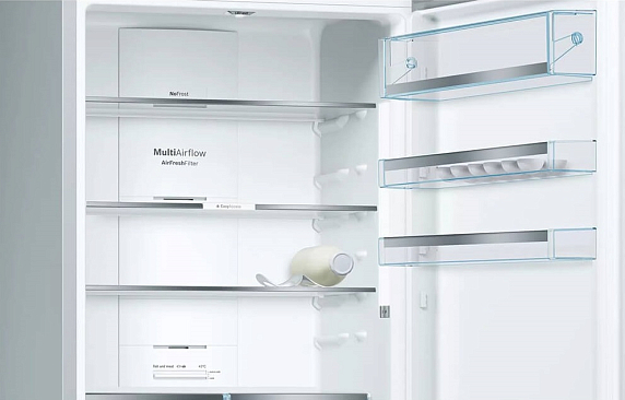 Аппарат оснащен пятью полками, из которых четыре можно регулировать по высоте, а одна полка фиксирована. Все полки изготовлены из высокопрочного стекла, что обеспечивает их долговечность и удобство в использовании. Есть также выдвижные полки EasyAccess, которые облегчают доступ к продуктам. Для хранения бутылок предусмотрена специальная полка. На дверце расположены четыре полки, а также три подставки для яиц. Внутреннее освещение холодильной камеры выполнено на светодиодах, что обеспечивает яркое и экономичное освещение. Этот двухкамерный продукт оснащен тремя ящиками в морозильной камере, что позволяет удобно и рационально использовать пространство для хранения различных продуктов. Особенностью является наличие системы VarioZone, которая позволяет легко изменять положение полок в зависимости от потребностей пользователя. Это очень удобно, если вам нужно разместить в девайсе крупногабаритные продукты или блюда. Кроме того, в комплекте идет ванночка для льда, что будет полезно для любителей прохладительных напитков.