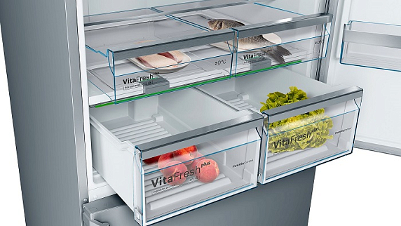- Ящики VitaFresh plus сохраняют свежесть овощей и фруктов в 2 раза дольше. Благодаря возможности настроить температуру, срок годности продуктов с особым требованием к хранению, например, рыба, мясо и другие, можно держать в холодильнике дольше. За счет новой выдвижной конструкции проще доставать ящики для того, чтобы создать дополнительное пространство.
