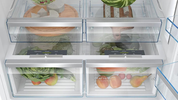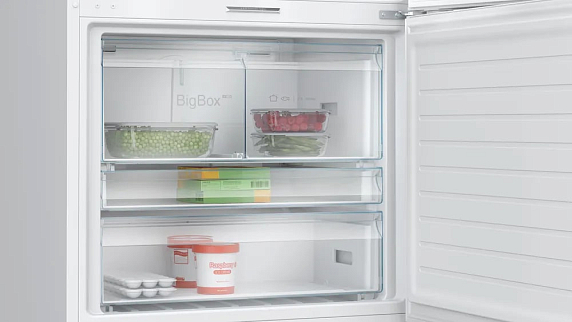 Холодильный отсек оборудован тремя основными полками, две из которых регулируются по высоте, что даёт гибкость расположения и удобство размещения высоких ёмкостей и контейнеров; дополнительно присутствуют шесть фиксированных площадок, позволяющих поддерживать порядок. В дверце предусмотрена полка для бутылок и три подставки для яиц, а светодиодное внутреннее освещение обеспечивает равномерный и экономичный световой поток, упрощающий обзор даже в тёмное время суток. Для хранения фруктов и овощей предусмотрена зона VitaFresh, которая помогает дольше сохранять полезные качества и структуру продуктов за счёт оптимального уровня влажности и температурного режима.