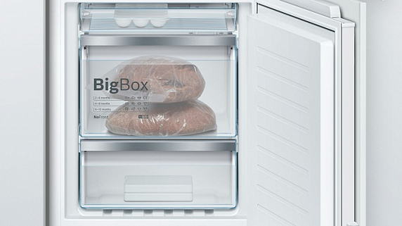 Двухкамерный холодильник Bosch KIF86HD20R — встраиваемая модель с зоной свежести с VitaFresh pro и системой охлаждения NoFrost. Морозильная камера расположена снизу, оснащена 3 ящиками для хранения продуктов, включая BigBox. Холодильное отделение укомплектовано 3 полками из закаленного стекла, 2 из которых можно переставлять по высоте, а также 2 зонами свежести VitaFreshPro и VitaFreshPro 0°C. Управление осуществляется непосредственно с помощью функции TouchControl и синхронизации с приложением Home Connect.