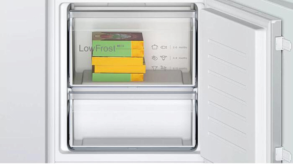 Двухкамерный холодильник Bosch KIV 87 NSF0 — встраиваемая модель с ящиком для овощей и фруктов MultiBox. Система LowFrost уменьшает количество льда в морозильной камере, устраняя необходимость в частом размораживании. Благодаря оптимальным условиям хранения продукты сохраняют идеальную консистенцию — например, мороженое больше не будет слишком твердым или слишком мягким.