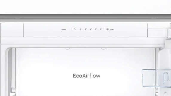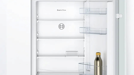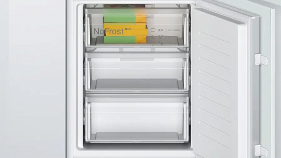 Встраиваемый двухкамерный холодильник Bosch KIN865SE0 оснащен вместимостью 260 литров, из которых холодильное отделение обеспечивает 184 литра полезного объёма, а морозильная камера — 76 литров, что достаточно для средних и больших продуктовых запасов семьи. Интерьер продуман для гибкой организации хранения: четыре полки в холодном отделении, три из которых регулируются по высоте, позволяют адаптировать внутреннее пространство под высокие ёмкости и контейнеры; на дверце размещены три практичных полки для бутылок и соусов. Выдвижной контейнер MultiBox обеспечивает аккуратность хранения овощей и фруктов, предотвращая смешивание запахов и сохраняя структуру продуктов. Внутреннее светодиодное освещение равномерно освещает рабочие полки, делая содержимое хорошо видимым и облегчая поиск нужного продукта в любое время суток.