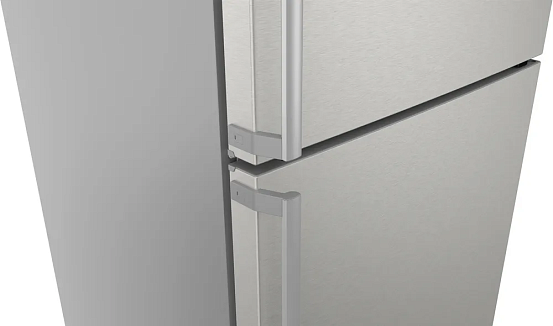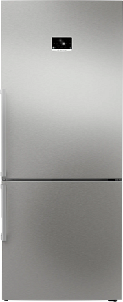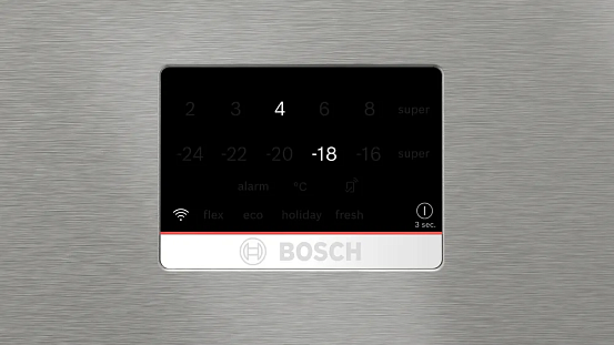 Двухкамерный холодильник Bosch KGP76AIC0N представлен в цвете нержавеющей стали, он подчёркивает премиальную направленность модели Serie 8 и объединяет изящную внешность с продуманной эргономикой. Вертикальная накладная ручка плавно вписывается в минималистичный фасад, а возможность перенавешивания дверцы и дверной упор справа дают свободу при планировке кухонного пространства. Чёткие линии, матовая поверхность и аккуратные сенсорные органы управления создают впечатление современного прибора, который станет визуальным центром интерьера без лишних деталей. На панели расположен информативный дисплей, позволяющий быстро задать параметры и отслеживать состояние без необходимости открывать камеры.