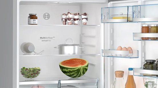 Технологическая начинка ориентирована на сохранность свежести и простоту эксплуатации. Система охлаждения холодильной и морозильной камер — No Frost, исключающая образование наледи и уменьшающая необходимость ручного ухода. Механизмы автоматического размораживания действуют в обоих отсеках, обеспечивая стабильный режим без перебоев. MultiAirflow распределяет прохладный воздух равномерно, предотвращая температурные градиенты, а зона VitaFresh поддерживает оптимальные условия для овощей, фруктов и мяса, существенно продлевая срок хранения продуктов при сохранении текстуры и витаминов.