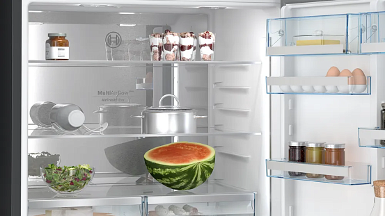 Технологическая часть ориентирована на поддержание стабильного микроклимата и свежести: система охлаждения холодильной части No Frost предотвращает образование инея и избавляет от ручного размораживания, а автоматический режим размораживания освобождает от рутинного обслуживания. MultiAirflow обеспечивает равномерное распределение холодного воздуха по полкам, минимизируя перепады температуры при частом открытии дверей. Зона свежести VitaFresh поддерживает оптимальные условия для овощей, фруктов и мясных изделий, продлевая срок хранения благодаря контролю влажности и температурных параметров.