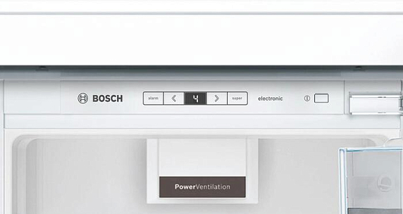 Встраиваемый холодильник Bosch KIR 81 AFE0 обладает удобными размерами для установки: высота – 177.2 см, ширина – 55.8 см, глубина – 54.5 см. Дверной упор расположен справа, но есть возможность его перенавешивания. Монтаж двери осуществляется по технике плоских шарниров.