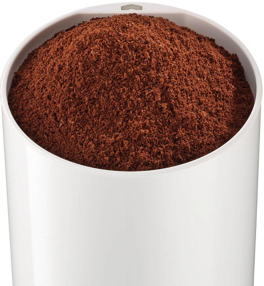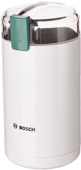 Кофемолка Bosch MKM 6000 — модель в белом цвете, измельчение производится при помощи ножей из нержавеющей стали.