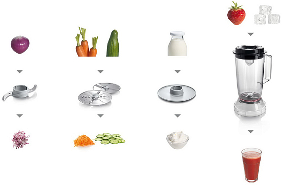 В комплект входит пластиковый блендер на 1 литр, подходящий для смузи, коктейлей и жидких смесей. Дополнительные насадки расширяют функциональность комбайна. Двухсторонние диски позволяют выполнять крупную и мелкую шинковку, тереть овощи и сыр, а венчик используется для взбивания. Металлические элементы допускают мытьё в посудомоечной машине, что упрощает уход.